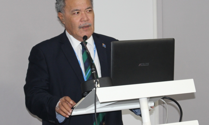 Prime Minister of Tuvalu, Hon Enele Sopoaga, speaking at the UNFCCC COP21, 2015. Photo: SPREP