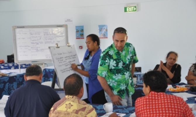 Photo by Diane McFadzien: Joseph Brider (right) and Mii Matamaki (left) from Cook Islands National Environment Service working with stakeholders to seek their input into project governance structures.