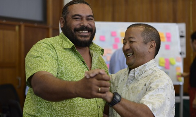 Director of Tonga Met Service 'Ofa Fa'anunu and Meteorologist-in-Charge (NOAA) Raymond Tanabe at the Partners & Donors Roundtable
