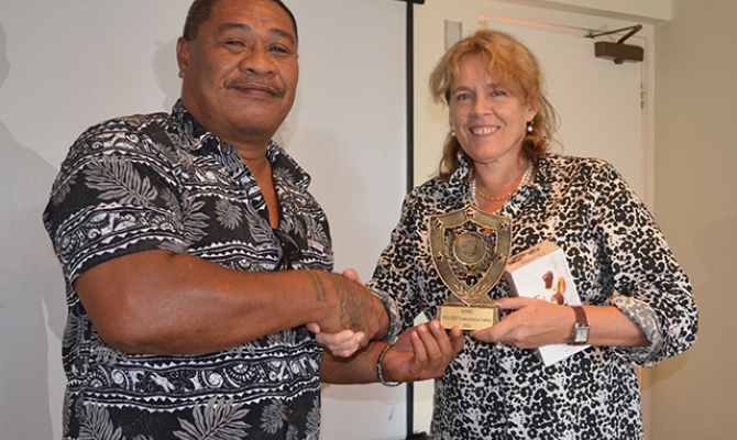 Mr Mafalu Lotolua (Tuvalu) receives his first place trophy from Ms Ms Lizbeth Cullity.