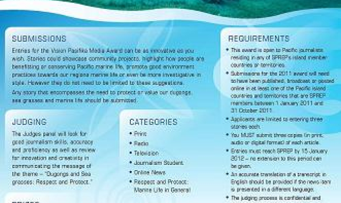 The theme for the 2011 Vision Pasifika Media Award was "Dugongs and Sea grasses: Respect and Protect", and called upon Pacific media workers throughout the region to submit their news items on dugongs, sea grasses, and marine life in general.
